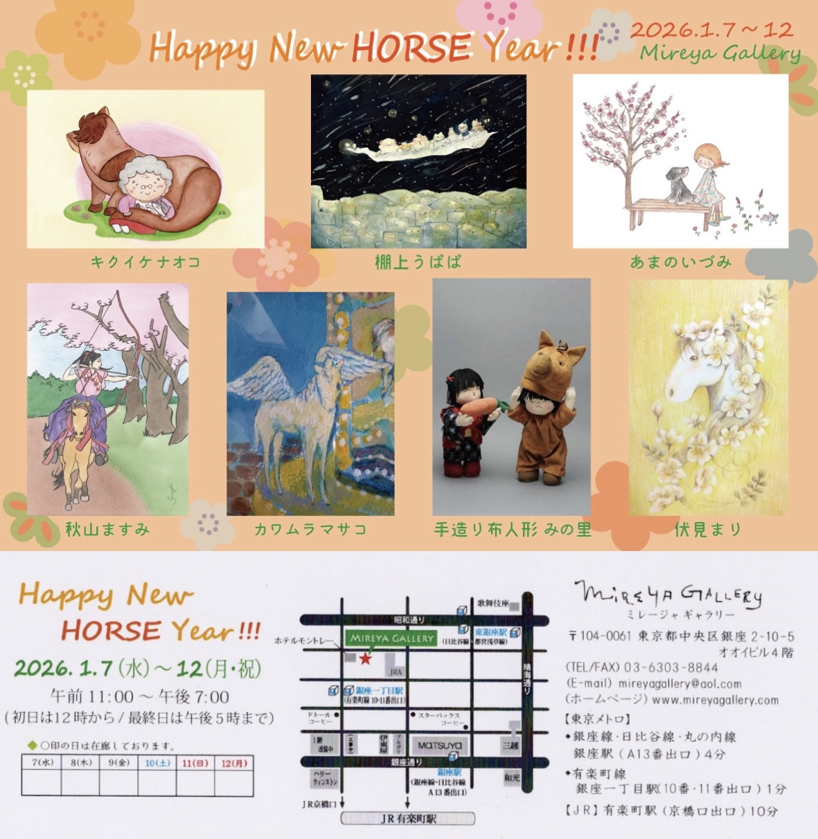 「 Happy New HORSE Year !!! 」展に参加させていただきます。 馬年のイラストと共にほっこりイラストを展示いたします! 是非お気軽にお越しください! 心よりお待ちしております。 2026年1月7日(水)~13(月) 11時~19時まで (初日は12時から、最終日は17時まで) 場所 : 銀座ミレージャギャラリー